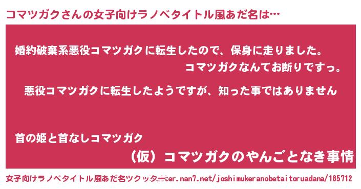| 男性向けラノベタイトル風あだ名 | 『この素晴らしい世界にコマツガクを!』 |