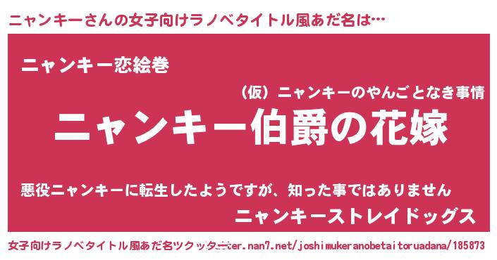 ニャンキーさんの女子向けラノベタイトル風あだ名は… 『ニャンキー伯爵の花嫁』『ニャンキー恋絵巻』『ニャンキーストレイドッグス』 ツクッター #女子向けラノベタイトル風あだ名ツクッター http://tkutter.nan7.net/joshimukeranobetaitoruadana/185873/