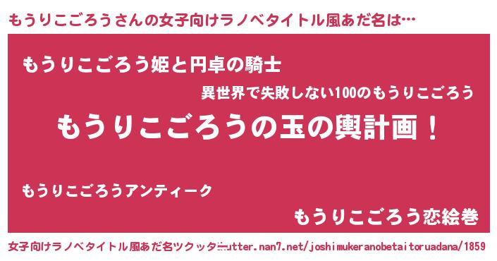 | 男性向けラノベタイトル風あだ名 | 『もうりこごろう~年齢イコール彼女いない歴の魔法使い~』 |