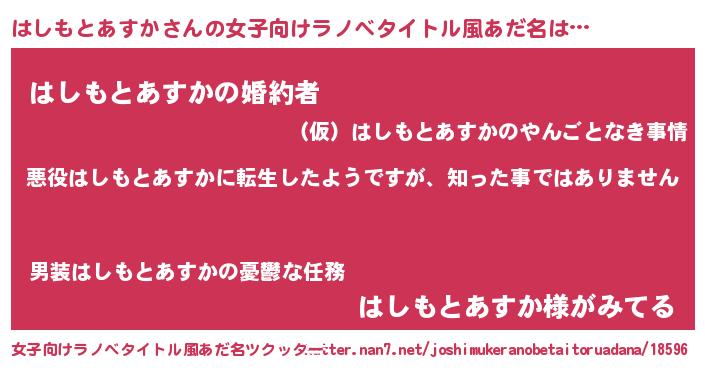 | 男性向けラノベタイトル風あだ名 | 『この素晴らしい世界にはしもとあすかを!』 |
