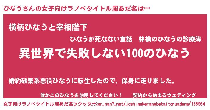 | 男性向けラノベタイトル風あだ名 | 『ひなうという概念が存在しない退屈な世界 』 |