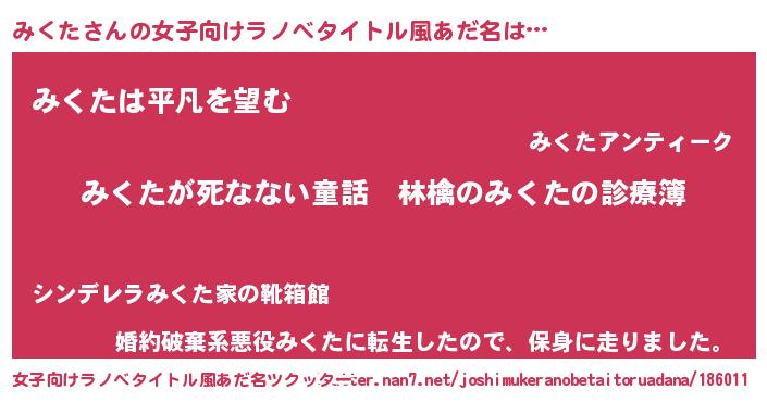| 男性向けラノベタイトル風あだ名 | 『魔弾の王とみくた』『ミクタスレイヤー』 |