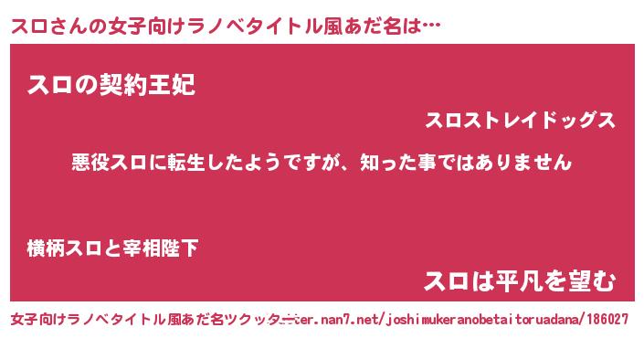 | 男性向けラノベタイトル風あだ名 | 『この素晴らしい世界にスロを!』 |
