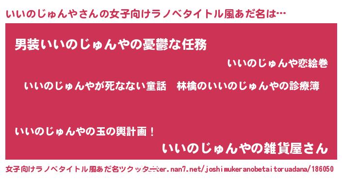 | 男性向けラノベタイトル風あだ名 | 『魔弾の王といいのじゅんや』 |
