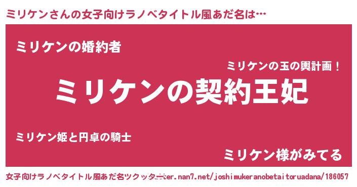 | 男性向けラノベタイトル風あだ名 | 『誰もが恐れるあのミリケンが、ぼくの専属メイドになるようです。』 |