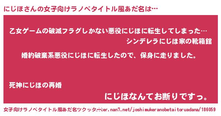 | 男性向けラノベタイトル風あだ名 | 『ニジホスレイヤー』『魔弾の王とにじほ』 |