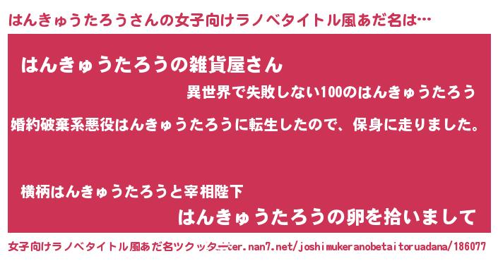 | 男性向けラノベタイトル風あだ名 | 『ハンキュウタロウスレイヤー』 |