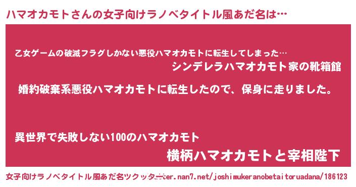 | 男性向けラノベタイトル風あだ名 | 『ハマオカモトスレイヤー』 |