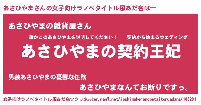 | 男性向けラノベタイトル風あだ名 | 『誰もが恐れるあのあさひやまが、ぼくの専属メイドになるようです。』 |