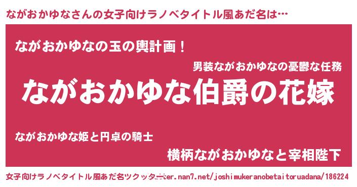ながおかゆなさんの女子向けラノベタイトル風あだ名は… 『ながおかゆな伯爵の花嫁』『ながおかゆなの玉の輿計画!』『横柄ながおかゆなと宰相陛下』 ツクッター #女子向けラノベタイトル風あだ名ツクッター http://tkutter.nan7.net/joshimukeranobetaitoruadana/186224/