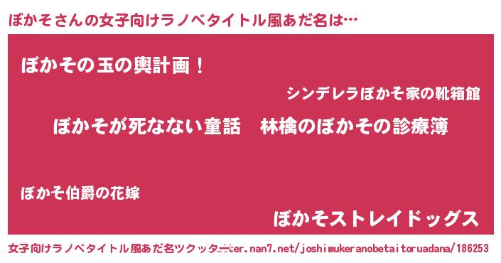 ぼかそさんの女子向けラノベタイトル風あだ名は… 『ぼかそが死なない童話 林檎のぼかその診療簿』『ぼかその玉の輿計画!』『ぼかそストレイドッグス』 ツクッター #女子向けラノベタイトル風あだ名ツクッター http://tkutter.nan7.net/joshimukeranobetaitoruadana/186253/