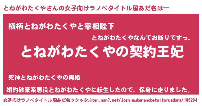 | 男性向けラノベタイトル風あだ名 | 『とねがわたくやという概念が存在しない退屈な世界 』 |