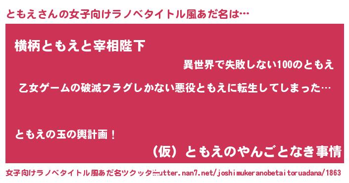 | 男性向けラノベタイトル風あだ名 | 『この素晴らしい世界にともえを!』 |