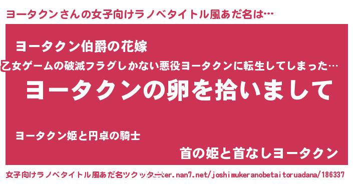| 男性向けラノベタイトル風あだ名 | 『ダンジョンにヨータクンを求めるのは間違っているだろうか』 |