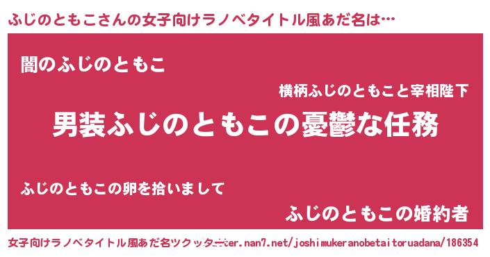 ふじのともこさんの女子向けラノベタイトル風あだ名は… 『男装ふじのともこの憂鬱な任務』『闇のふじのともこ』『ふじのともこの婚約者』 ツクッター #女子向けラノベタイトル風あだ名ツクッター http://tkutter.nan7.net/joshimukeranobetaitoruadana/186354/