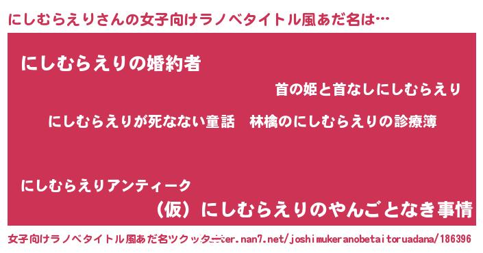 | 意味不明あだ名 | 『住所不定無職にしむらえり(68歳)』 |