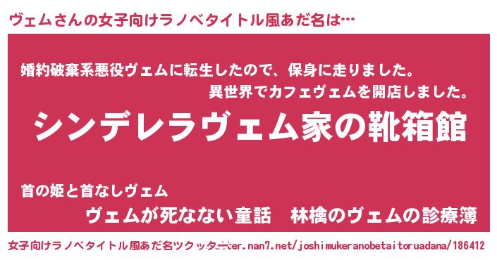 | ヘコむあだ名 | 『ヴェム(笑)』『豆乳』『ヴェにー』 |