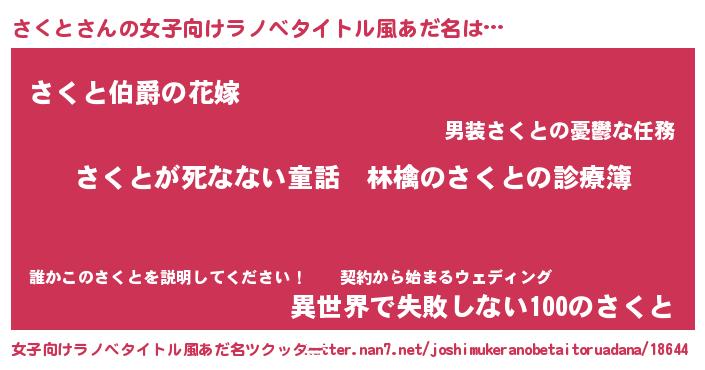 | 男性向けラノベタイトル風あだ名 | 『魔弾の王とさくと』 |