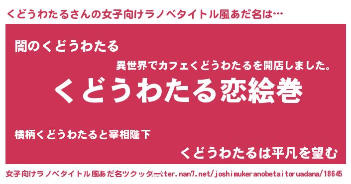 | 男性向けラノベタイトル風あだ名 | 『おまえをオタクにしてやるから、俺をくどうわたるにしてくれ! 』 |