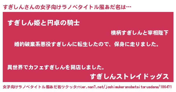 | 男性向けラノベタイトル風あだ名 | 『転生したらすぎしんだった件』 |
