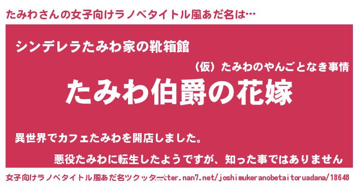 たみわさんの女子向けラノベタイトル風あだ名は… 『たみわ伯爵の花嫁』『シンデレラたみわ家の靴箱館』『悪役たみわに転生したようですが、知った事ではありません』 ツクッター #女子向けラノベタイトル風あだ名ツクッター http://tkutter.nan7.net/joshimukeranobetaitoruadana/18648/