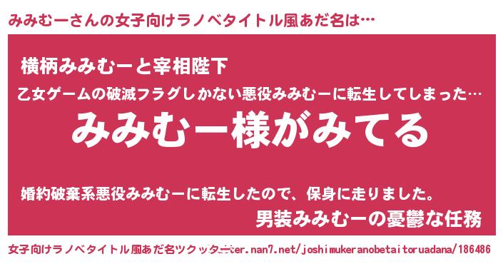 | 男性向けラノベタイトル風あだ名 | 『みみむーの嫁は女の子じゃないと思った?』 |