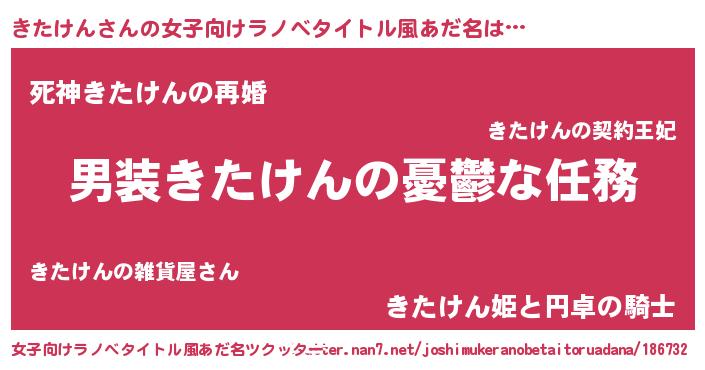 | 男性向けラノベタイトル風あだ名 | 『うちのきたけんが世界を掌握している!』 |