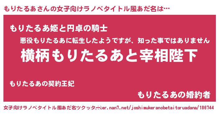 | 男性向けラノベタイトル風あだ名 | 『もりたるあに滅ぼされるだけの簡単なお仕事です』 |
