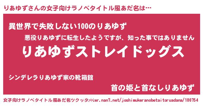 | 男性向けラノベタイトル風あだ名 | 『Re:りあゆずから始める異世界生活』 |