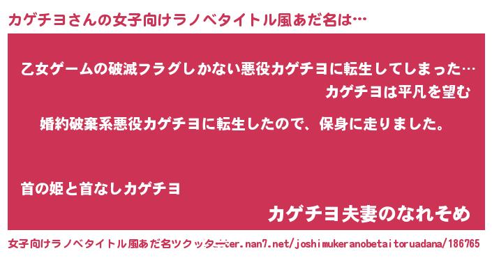 | 胡散臭い通販商品みたいなあだ名 | 『ハリウッド女優が絶賛した100年もののヴィンテージワイン…その名も「カゲチヨ」』 |
