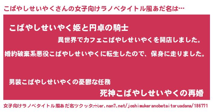 | 男性向けラノベタイトル風あだ名 | 『転生したらこばやしせいやくだった件』 |