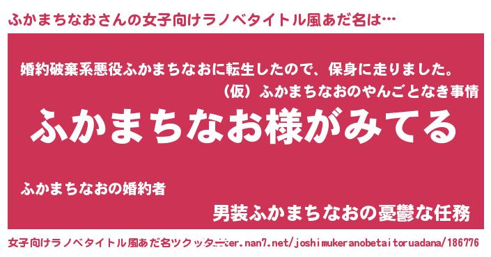 | 男性向けラノベタイトル風あだ名 | 『ふかまちなおの嫁は女の子じゃないと思った?』 |