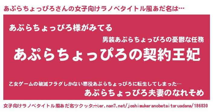 | 男性向けラノベタイトル風あだ名 | 『誰もが恐れるあのあぷらちょっぴろが、ぼくの専属メイドになるようです。』 |