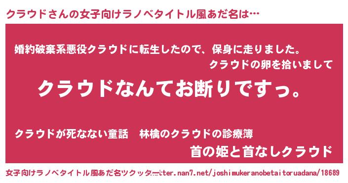 | ヒーロー風カッコイイあだ名 | 『ウルトラ戦士クラウド』『暗黒騎士クラ』 |