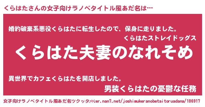 | 男性向けラノベタイトル風あだ名 | 『おまえをオタクにしてやるから、俺をくらはたにしてくれ! 』 |