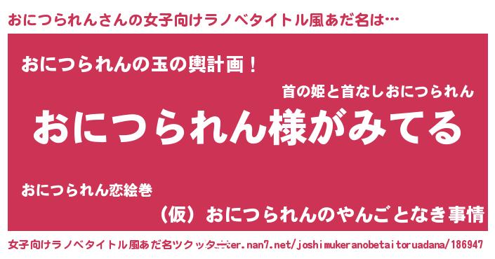おにつられんさんの女子向けラノベタイトル風あだ名は… 『おにつられん様がみてる』『おにつられんの玉の輿計画!』『(仮)おにつられんのやんごとなき事情』 ツクッター #女子向けラノベタイトル風あだ名ツクッター http://tkutter.nan7.net/joshimukeranobetaitoruadana/186947/