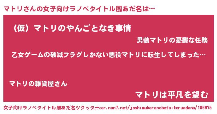 | 男性向けラノベタイトル風あだ名 | 『この素晴らしい世界にマトリを!』 |