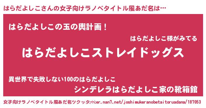 | 男性向けラノベタイトル風あだ名 | 『Re:はらだよしこから始める異世界生活』 |