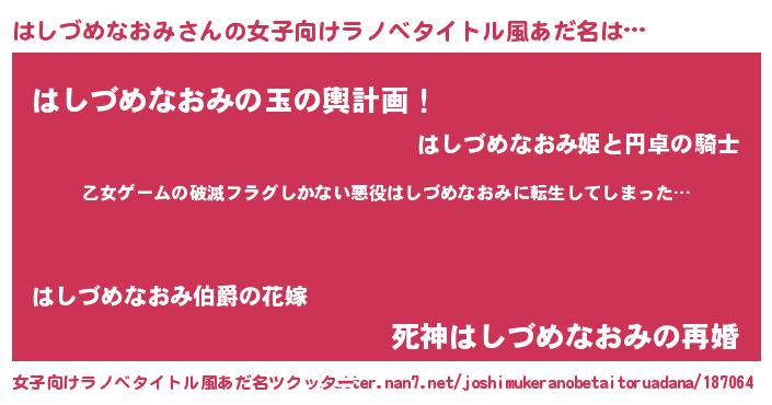はしづめなおみさんの女子向けラノベタイトル風あだ名は… 『乙女ゲームの破滅フラグしかない悪役はしづめなおみに転生してしまった…』『はしづめなおみの玉の輿計画!』『死神はしづめなおみの再婚』 ツクッター #女子向けラノベタイトル風あだ名ツクッター http://tkutter.nan7.net/joshimukeranobetaitoruadana/187064/