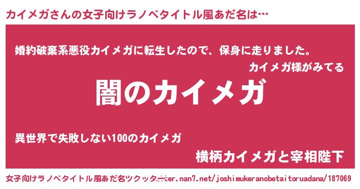 | 男性向けラノベタイトル風あだ名 | 『Re:カイメガから始める異世界生活』 |