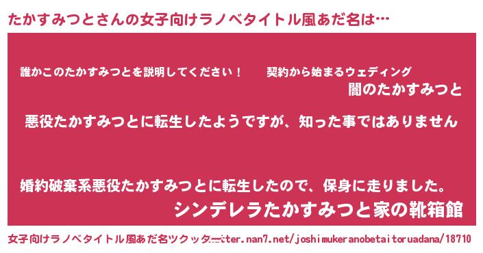 | 男性向けラノベタイトル風あだ名 | 『この素晴らしい世界にたかすみつとを!』 |