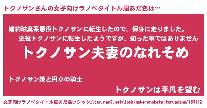 | 男性向けラノベタイトル風あだ名 | 『おまえをオタクにしてやるから、俺をトクノサンにしてくれ! 』 |