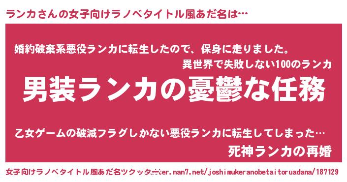 | 男性向けラノベタイトル風あだ名 | 『うちのランカが世界を掌握している!』 |