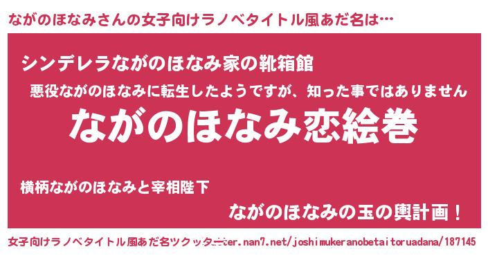 | 男性向けラノベタイトル風あだ名 | 『おまえをオタクにしてやるから、俺をながのほなみにしてくれ! 』 |