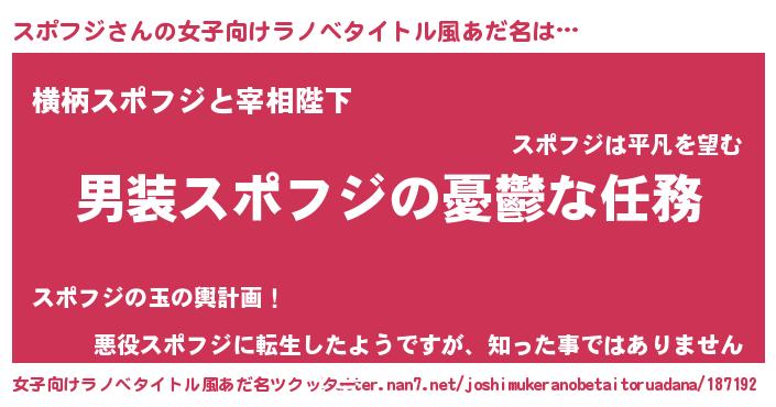 スポフジさんの女子向けラノベタイトル風あだ名は… 『男装スポフジの憂鬱な任務』『横柄スポフジと宰相陛下』『悪役スポフジに転生したようですが、知った事ではありません』 ツクッター #女子向けラノベタイトル風あだ名ツクッター http://tkutter.nan7.net/joshimukeranobetaitoruadana/187192/