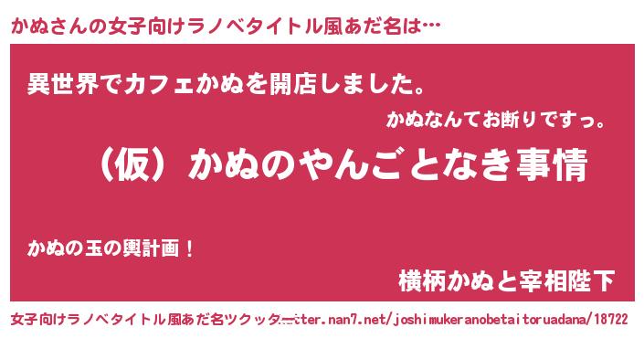 | 男性向けラノベタイトル風あだ名 | 『かぬの憂鬱』『魔法科高校のかぬ』 |