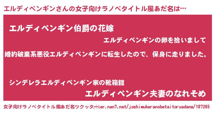 | 男性向けラノベタイトル風あだ名 | 『転生したらエルディペンギンだった件』 |