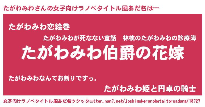 | 男性向けラノベタイトル風あだ名 | 『やはりたがわみわの青春ラブコメはまちがっている 』 |