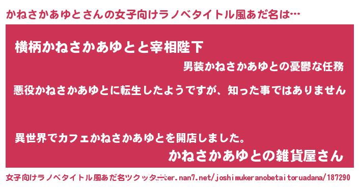 | 男性向けラノベタイトル風あだ名 | 『この素晴らしい世界にかねさかあゆとを!』 |