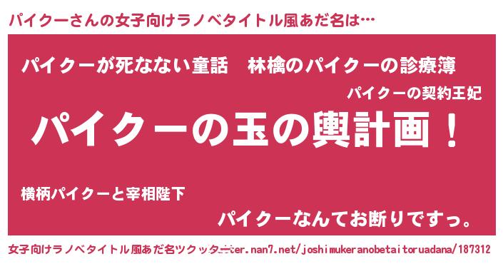 | 男性向けラノベタイトル風あだ名 | 『パイクー~年齢イコール彼女いない歴の魔法使い~』 |